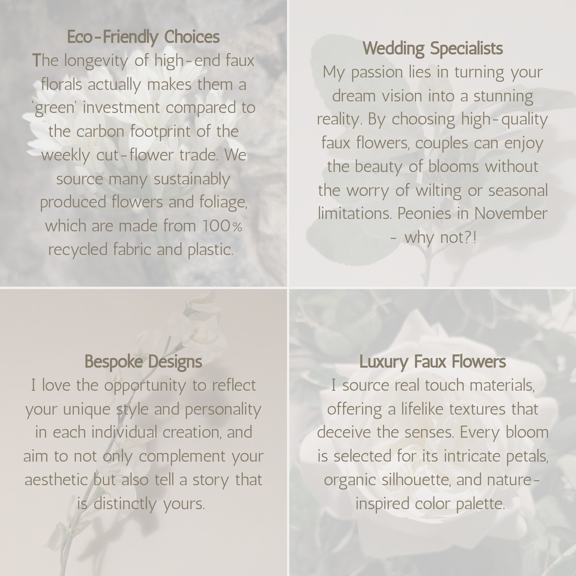 Welcome to the world of exquisite faux floral design, where artistry meets opulence. As a designer, I specialise in crafting breathtaking arrangements that mirror the delicate grace of real blooms using only the finest luxury artificial flowers. Every bloom and foliage stem is meticulously selected and hand-placed to create stunning displays that elevate any space or occasion.
